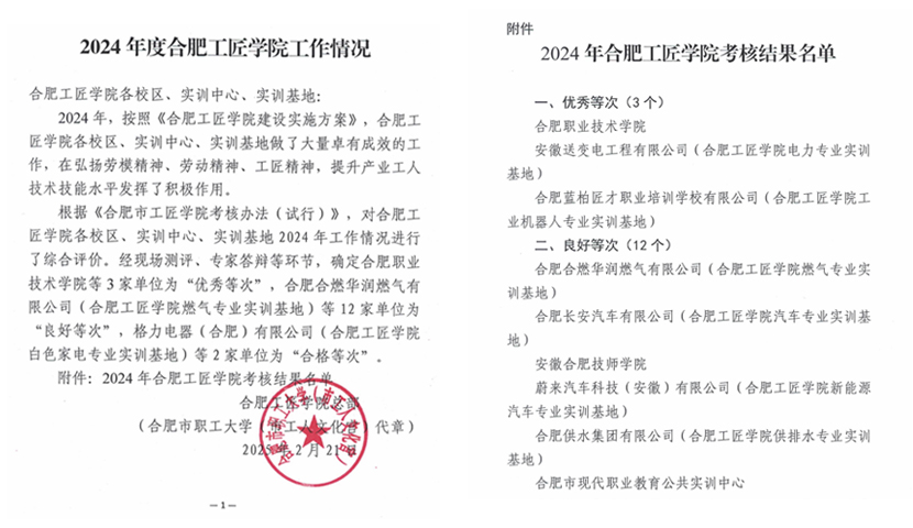 近日,合肥市职工大学公布了2024年度合肥工匠学院工作情况考核结果,伟德官网凭借在工匠精神培育和技术技能提升方面的卓越表现,荣获“优秀等次”称号。这是对学校在职业教育领域深耕细作、砥砺前行的高度认可,也是全体师生共同努力的成果。