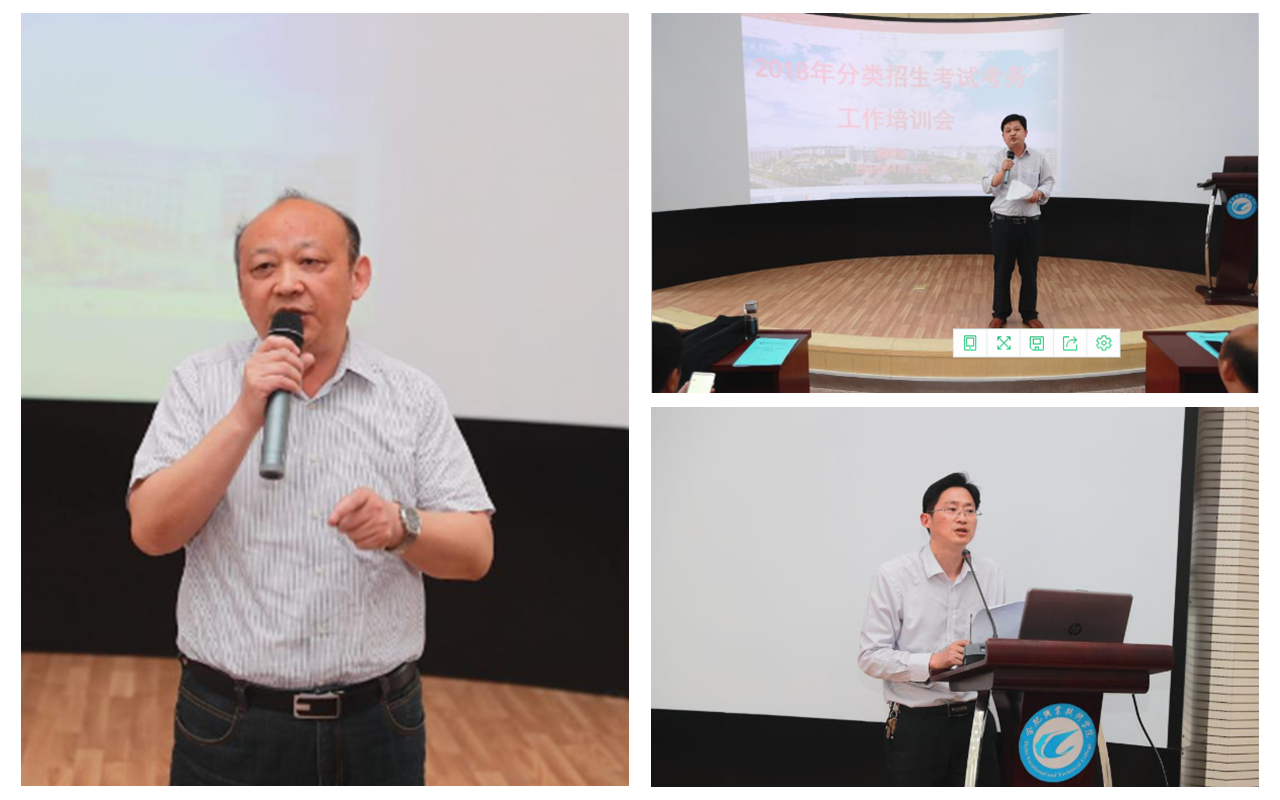 教务处副处长胥振国简要汇报2018年分类招生工作概况。他将今年招生各项工作总结归纳为七个阶段:2018年分类招生启动阶段、分类招生章程制定阶段、分类招生宣传阶段、学生网上报名及参加省统考阶段、省统考数据处理阶段、考生缴费及参加校考阶段、预录取及确认阶段。教务处副处长窦红平作题为《规范监考流程 敞开双臂欢迎考生——2018年分类招生考试考务(监考)培训》的专题报告,强调务必人人通过培训,顺利做好考务工作。