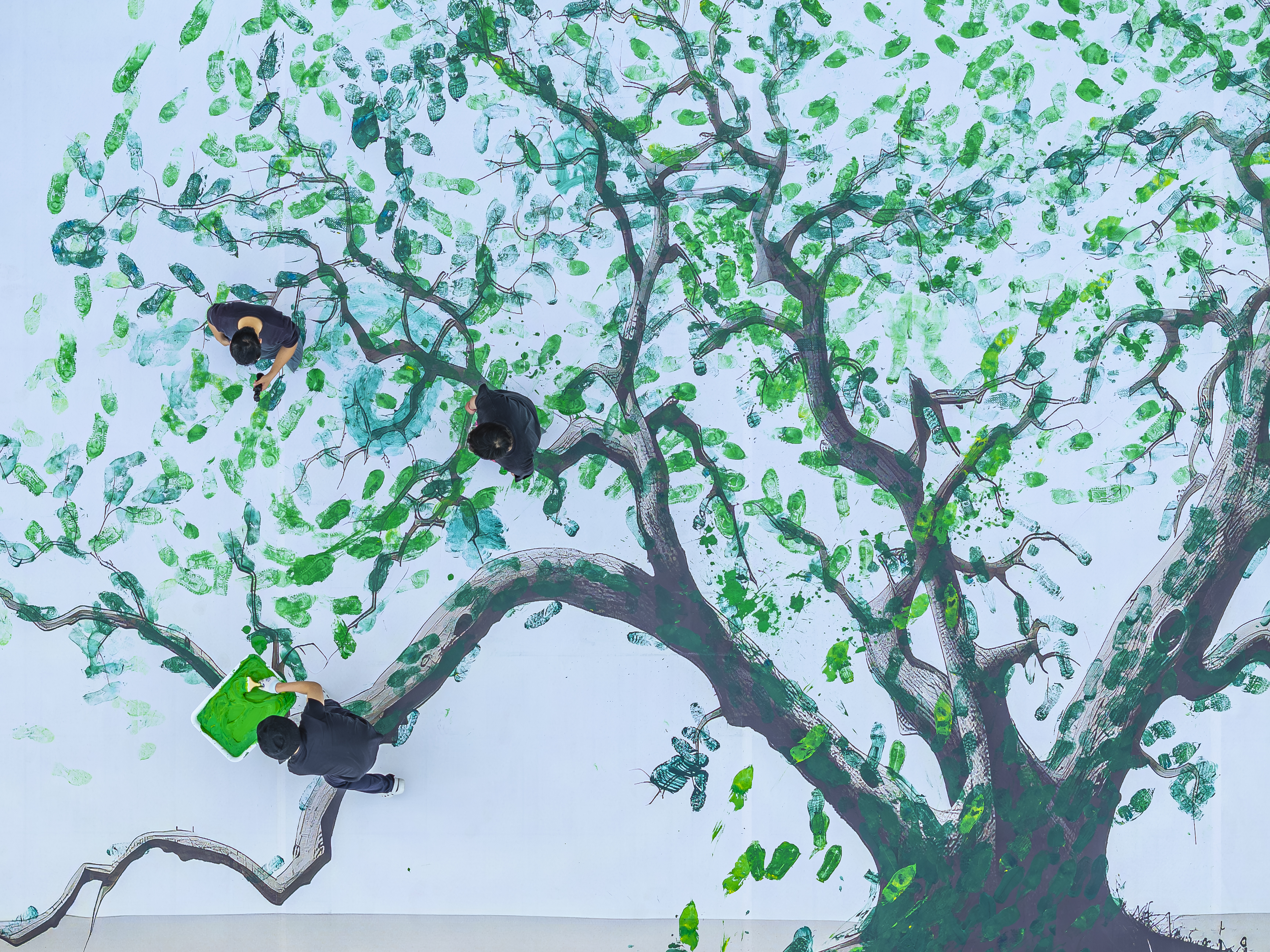 活动现场,一副巨大的的枯木绘画躺卧在校园内汇心湖畔地面。参与者们在校大学生记者站同学们的引导下有序踏上枯木,每一步都化作颜料中的一抹绿意。随着脚步的起落,深绿、浅绿、鹅黄的色彩层层晕染,枯木的纹路逐渐被生机勃勃的“枝叶”覆盖。更有同学手持画笔,在“绿叶”间点缀上粉嫩的花朵、嫩绿的小草与灵动的蝴蝶,一幅“枯木逢春”的生态画卷在足尖与笔触间徐徐展开。
