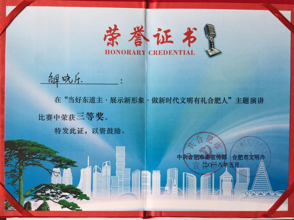 5月17日,由合肥市委宣传部、市文明办联合举办的“当好东道主展示新形象做新时代文明有礼合肥人”主题演讲比赛决赛如期进行。伟德官网解晓乐老师积极参加,顺利通过预赛,并从26名决赛选手中脱颖而出,荣获大赛三等奖。