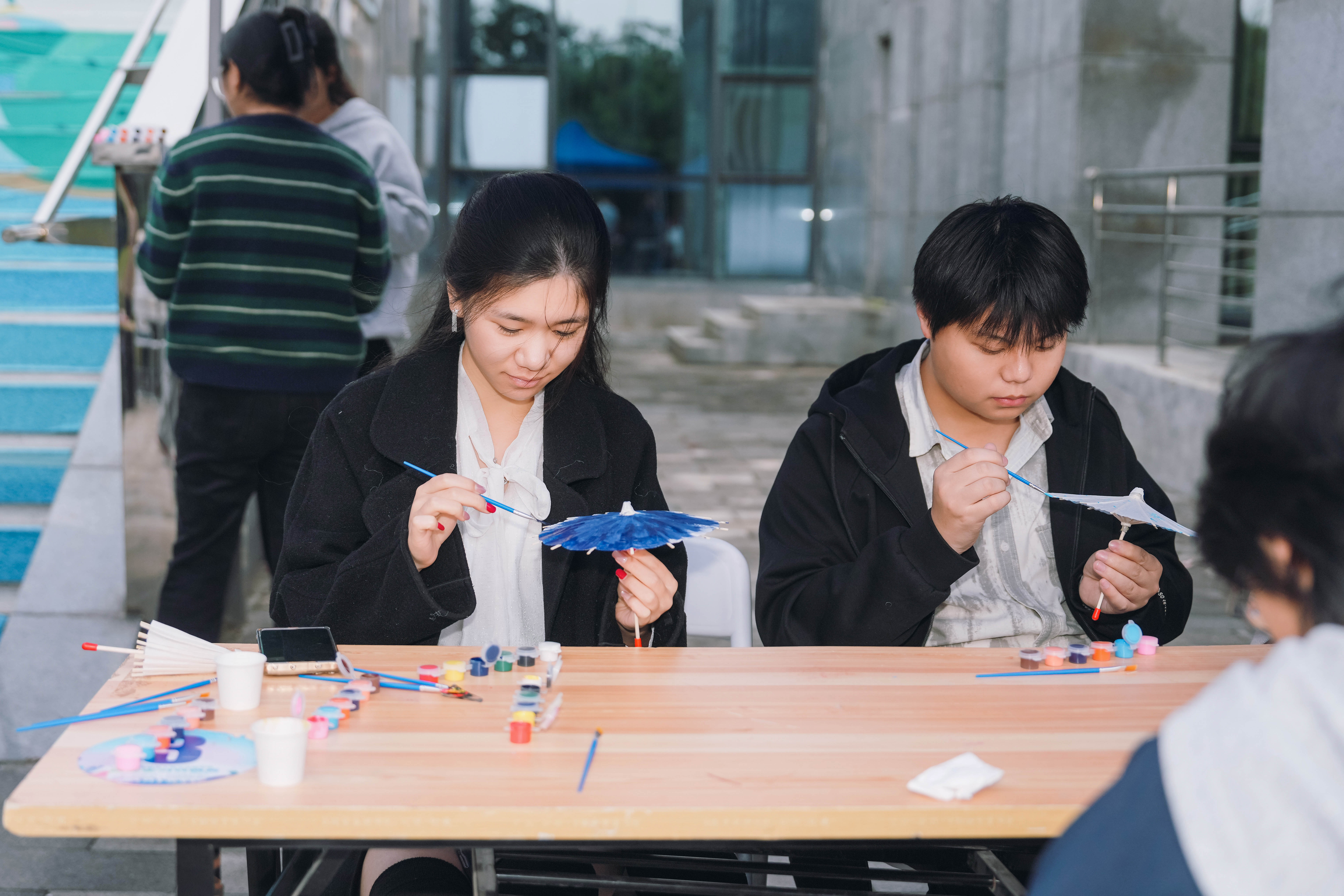 活动现场按社团特色划分体验区,各社团各展所长,解锁文化传承新方式。图南国学社下设的墨轩书法社,一边指导师生手绘油纸伞,在素白伞面勾勒山水花鸟,一边展出楷书工整、行书飘逸的书法作品,手把手教学握笔运笔;泼茶香茶学社设置“茶趣”互动环节,师生通过闻香品茶猜茶类,现场还演示盖碗泡茶流程,传递茶文化的雅致;雅韵汉学社成员身着各朝代汉服讲解服饰形制,带领大家制作传统发簪,展现服饰与首饰文化之美。
