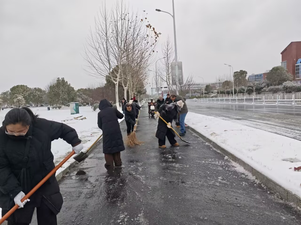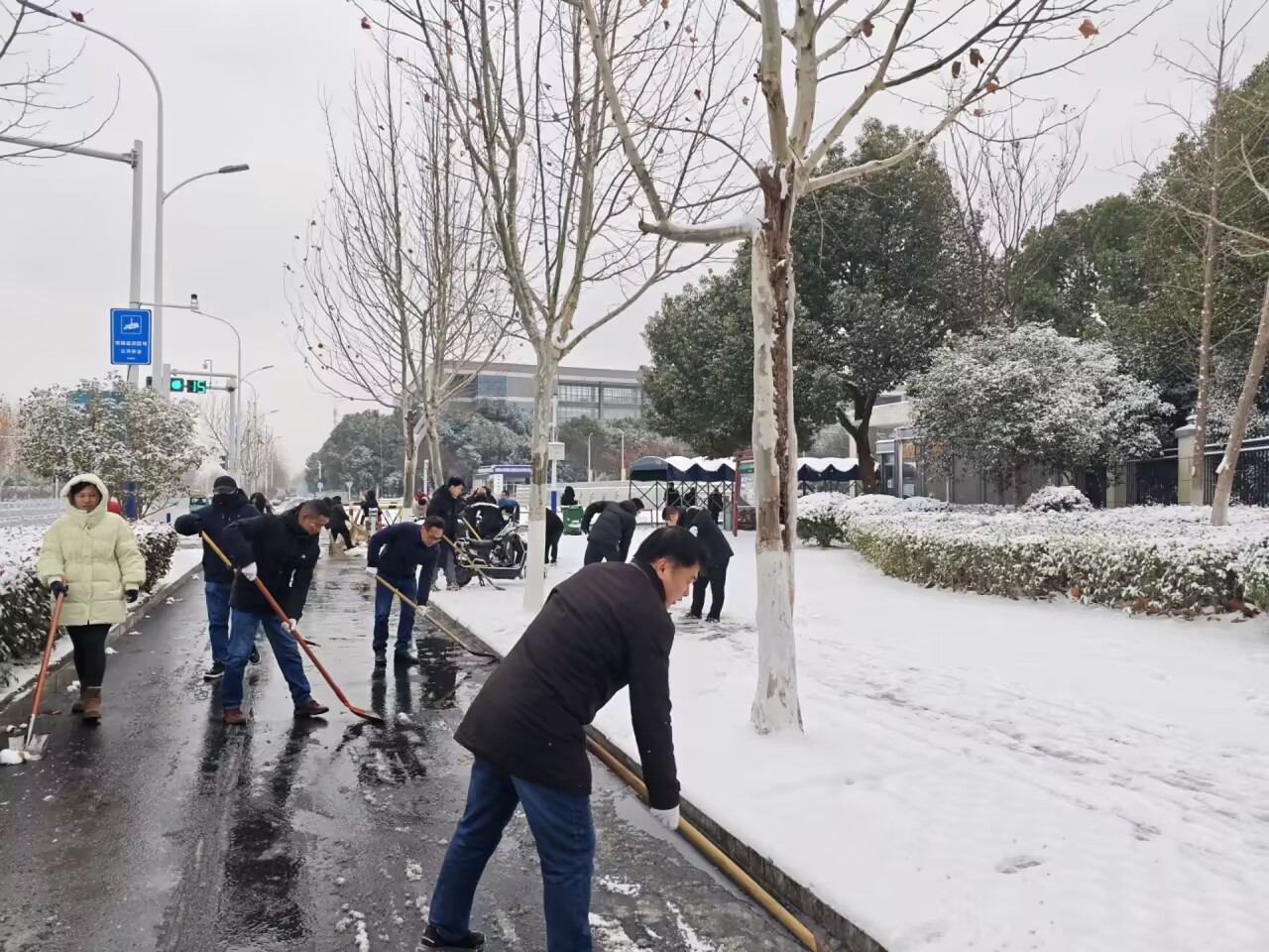 经过数小时的持续奋战,校园及凤凰山路段(校园门口至裕溪路段)的积雪积冰被基本清除,一条条“平安路”“暖心路”逐渐显现,为过往行人、车辆的安全通行提供了有力保障。