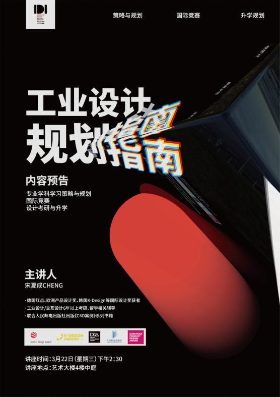 本次讲座主题是《工业设计专业规划指南》,分享者宋夏成有着多年的一线设计与教育培训经验,为学生讲授大学四年该如何学习与规划工业设计学习之路,内容包括:工业设计专业学习策略与规划、国际设计竞赛与企业项目的筹备、设计考研与升学建议等。