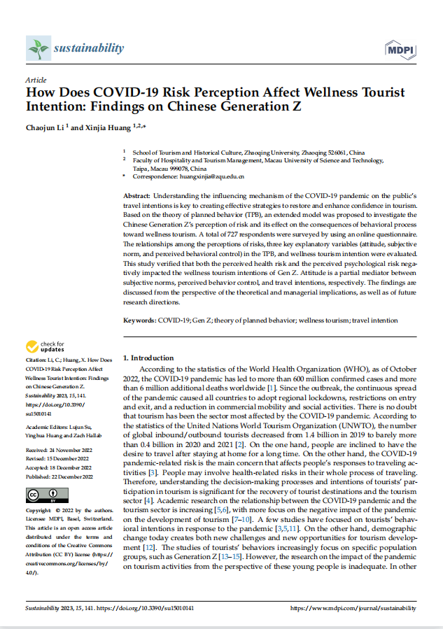 近日,国际学术期刊《sustainability》刊发我院李朝军、黄心甲合作论文《How Does COVID-19 Risk Perception Affect Wellness TouristIntention: Findings on Chinese Generation Z》。据悉,《sustainability》是SSCI和SCI双检索期刊,均为JCR数据库2区。