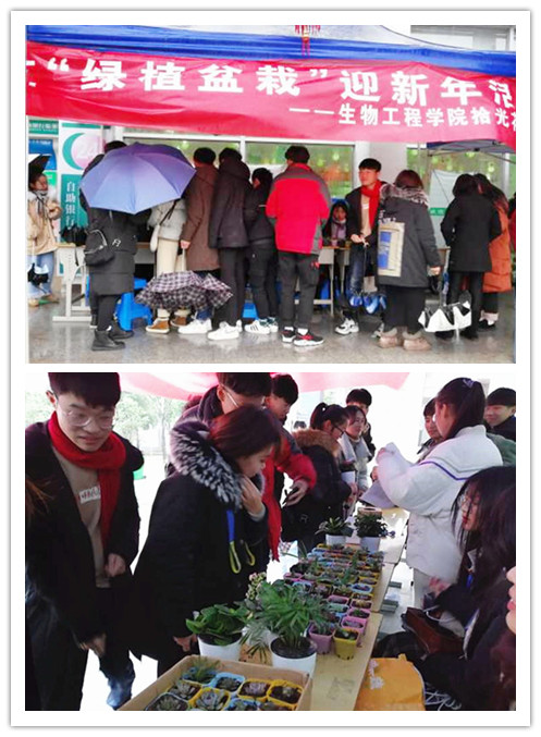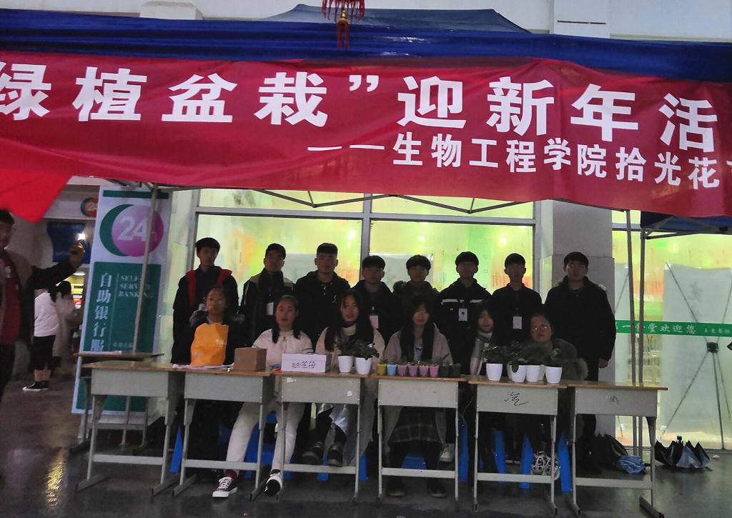 为了迎接新年的到来和响应创建文明校园号召,生物工程学院拾光花艺社团于12月26日下午在一食堂门口以抽签答题和抽幸运数字等方式举行“绿植迎新年”活动,将精美的盆栽赠送给广大的同学们。
