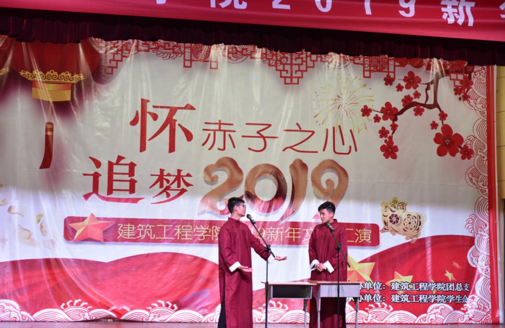整场晚会节目精彩纷呈,现场气氛热烈,台上台下,笑声、掌声、喝彩声此起彼伏,全场师生在一片欢声笑语中共庆新年。告别2018,奔向2019,我们将牢记习近平总书记的话,奋斗路上,我们都是奔跑者,我们都是追梦人!(供稿:建筑工程学院 编辑:朱鹏飞)