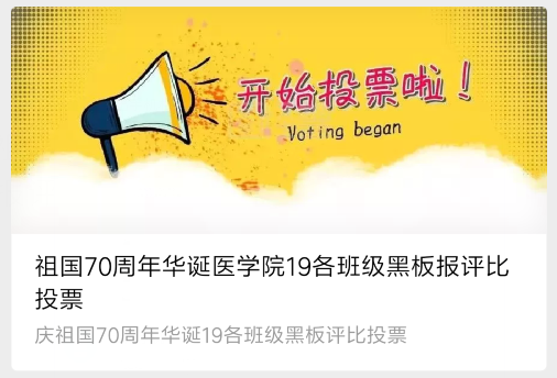 为了庆祝新中国成立70周年,培养学生的爱国情怀,医学院团总支于10月1日至10月15日组织学生开展了“欢庆新中国成立70周年”主题黑板报评比活动。本次活动本着公正、公平的原则,从内容、板书与文字、插图与美工、排版与设计、标题与创新五个方面分别对每幅参赛板报进行评比。