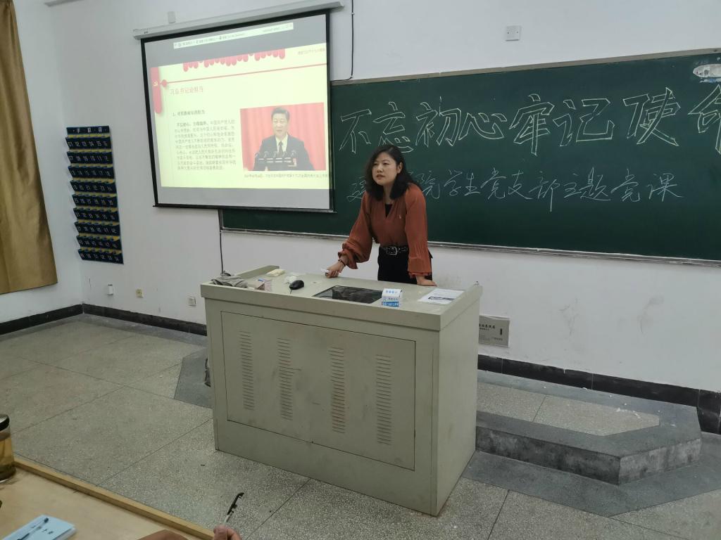 施芳芳首先就进一步认识“不忘初心、牢记使命”主题教育的背景和意义作了分享。主题教育就是要引导广大党员在原有学习的基础上取得新进步,加深对习近平新时代中国特色社会主义思想和党中央大政方针的理解,学深悟透、融会贯通,增强贯彻落实的自觉性和坚定性,提高运用党的创新理论指导实践、推动工作的能力。引导广大党员坚定对马克思主义的信仰、对中国特色社会主义的信念,传承红色基因,增强“四个意识”、坚定“四个自信”、做到“两个维护”,自觉在思想上政治上行动上同党中央保持高度一致,始终忠诚于党、忠诚于人民、忠诚于马克思主义。然后,以“习近平总书记论担当”为主题共同学习了习近平总书记相关讲话精神,一起诵读习近平总书记对青年大学生的寄语和期望,并引导大家联系自身本职岗位,以实际行动践行担当精神。号召全体党员和入党积极分子要把握“守初心、担使命、找差距、抓落实”的总要求,认真反思,勇于解剖自己内心,用实际行动表现自我,不断提升自我,确保主题教育取得实效。