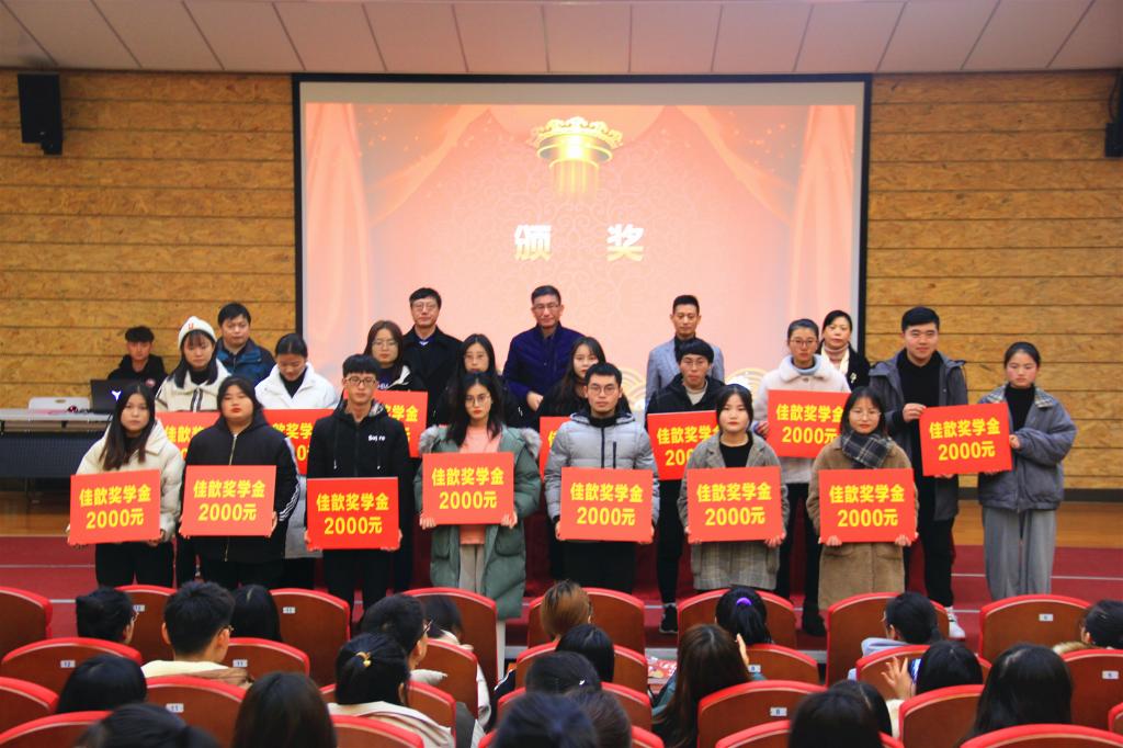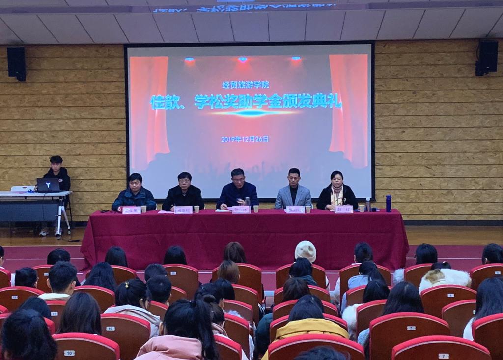 12月26日,经贸旅游学院在大学生活动中心一楼报告厅举行2019年佳歆、学松奖助学金颁发典礼。经贸旅游学院党总支书记梅亚松、院长赵红、党总支副书记尹仕果参加颁发典礼。佳歆奖学金设立者、上海佳歆房地产投资顾问有限公司董事长张启胜、副校长孙兴林出席颁发典礼。颁发典礼由尹仕果主持。