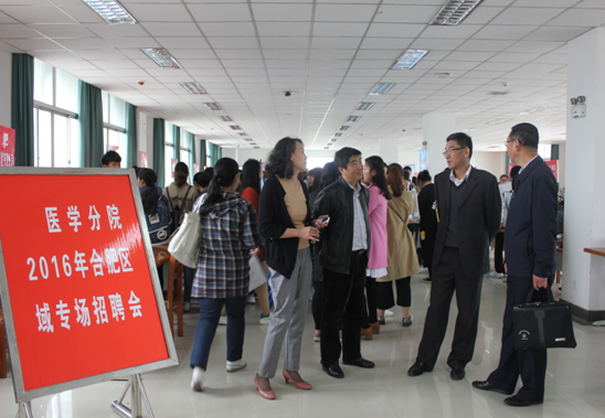 为积极响应学院号召,为合肥区域经济发展输送优秀人才、服务地方经济。根据去年学生就业区域调研情况,结合今年就业的严峻形势,医学分院在前期准备充分、精心筹划下于2016年4月25日上午在图书馆举行合肥区域专场招聘会。学院副院长孙兴林、招生就业处处长张俊娜等亲临招聘会现场指导工作。