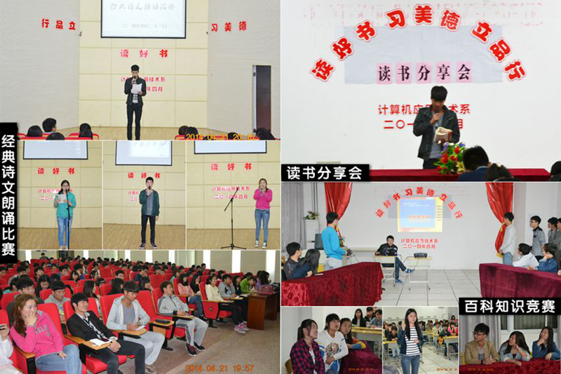 本届读书节开展了启动仪式暨读书报告会、读书分享会、经典诗文朗诵比赛、百科知识竞赛、颁奖晚会共五项活动,历史一个月。在这一个多月中,同学们与书为友,共享读书的快乐。校园里书声朗朗,书香弥漫,活动取得了预期成效。具体体现在两个方面:一是活动主题鲜明,内容丰富,形式多样。五项内容活动都围绕“读书”这一主题,都通过广大同学喜闻乐见的形式表现出来。二是活动覆盖面广,开展扎实,效果明显。本届读书节覆盖全系在校17个班级每一名同学,既有全系性的启动、表彰仪式,也有班级层面的分项活动。活动开展扎实有效,在全系范围内掀起了读书热潮,取得了积极成果,展现了同学们的精神面貌。