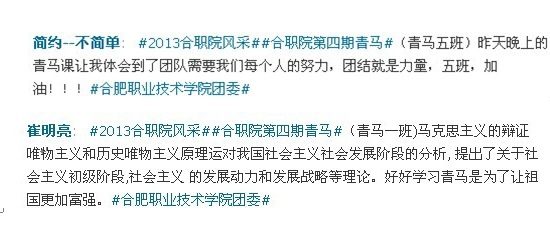 此次班会内容为各班级设计班旗、确定班级口号和班歌。各班班长在有限的时间里,集思广益,确定班级设计方案,并安排擅长绘画的同学负责绘旗,擅长歌唱的同学负责组织排练班歌。现场展示环节,各个班级展示班旗,详述设计理念,高喊班级口号,齐唱班歌,现场气氛十分热烈。班会结束后,很多学员在团委微博里发表感言,认为这是一次成功的、有意义的班会。培训班不仅开拓了思维,还增强了团队精神。