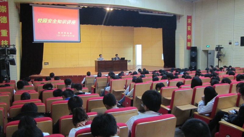 针对当前大学生普遍存在的安全防范意识淡薄,认识程度不够等问题,祝建平处长根据多年的工作经验,从疾病防疫、饮食安全、自然灾害、公共安全、意外伤害、交通安全、消防安全、网络信息共八个方面作了生动、直观、系统的讲解。结合近年来校园内发生的治安案例和各种诈骗行为等鲜活实例,祝处长特别强调了校园内防火、防盗、防诈骗的重要性,提醒同学们在校期间应提高自我防范意识,时刻保持清醒头脑,预防和减少各类事件发生。讲座持续一个半小时,同学们认真听讲,会场秩序良好。