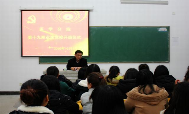 此次业余党校开班仪式共分为两个部分:医学分院党总支副书记张明做指导性讲话,学院副院长孙兴林给学生讲授第一节党课。