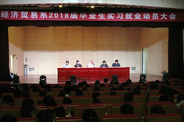 6月1日下午,经贸系2018届毕业生实习就业动员大会在院大学生活动中心举行。学院副院长周晓隆教授出席会议,经贸系相关负责人、辅导员、实习就业指导老师以及2018届全体毕业生参加会议。会议由经贸系副主任赵红(主持工作)副教授主持。