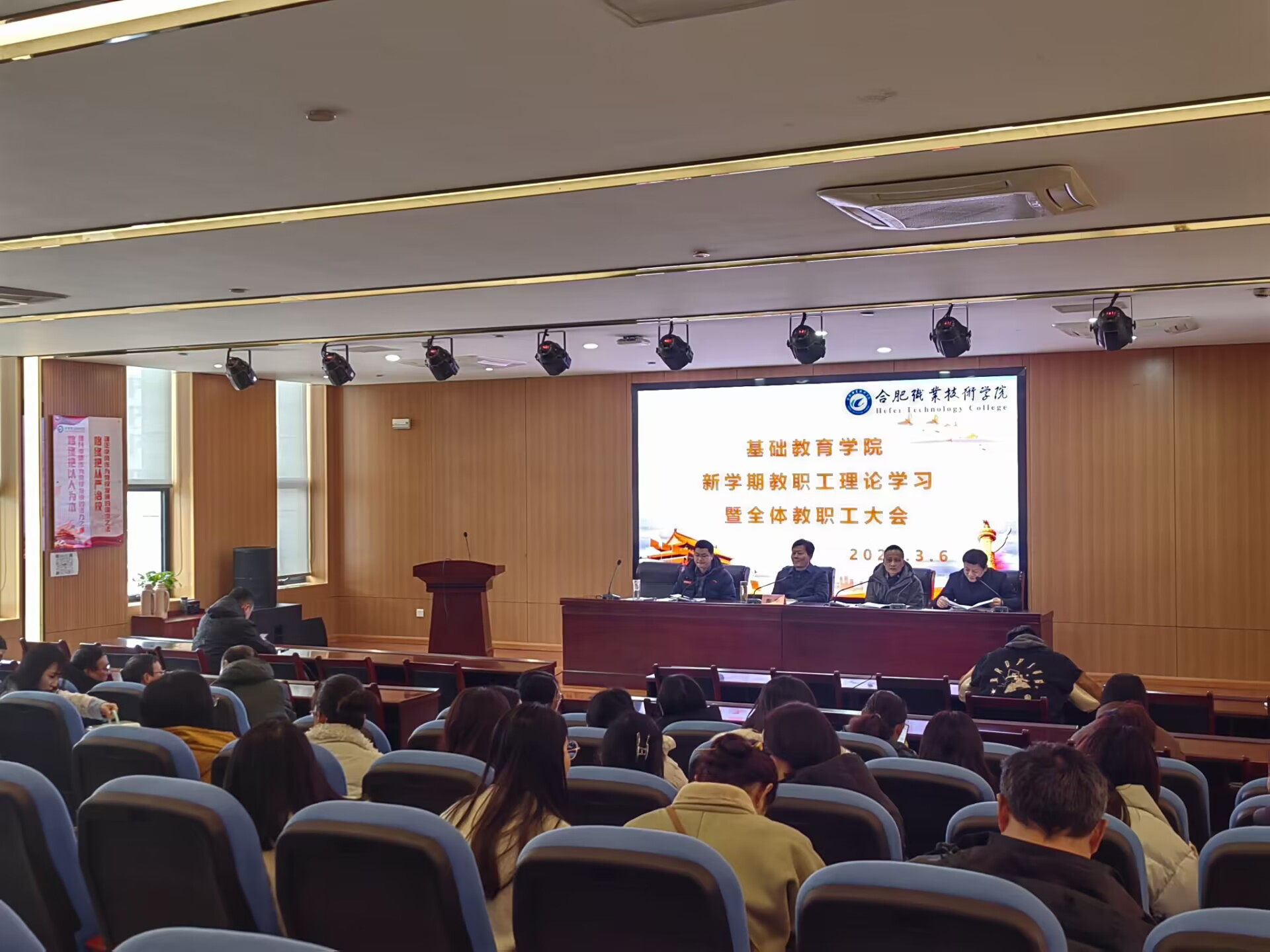 3月6日下午,基础教育学院在汇心湖校区图书馆一楼学术报告厅召开新学期政治理论学习会暨全体教职工大会。会议由学院副院长(主持工作)胡心红主持,联系学院的校领导陶宁出席。