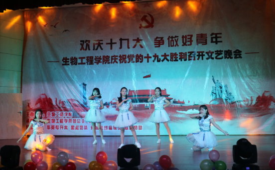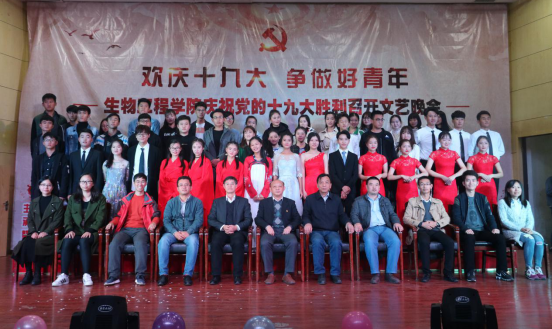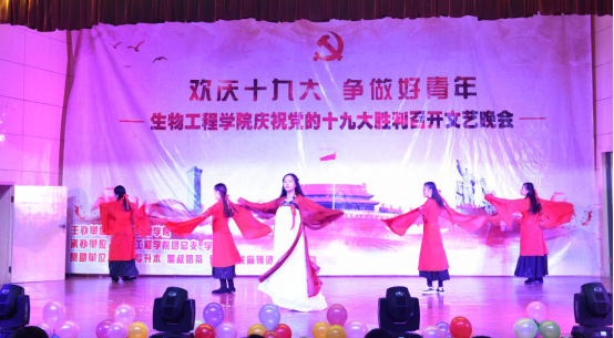 为热烈庆祝中国共产党第十九次全国代表大会的胜利召开,更好的引领学生践行社会主义核心价值观,逐梦新时代,生物工程学院于10月19日晚举办了专题文艺晚会。副校长周晓隆与生物工程学院领导、老师以及五百余名学生共同度过了欢庆、热闹的夜晚。
