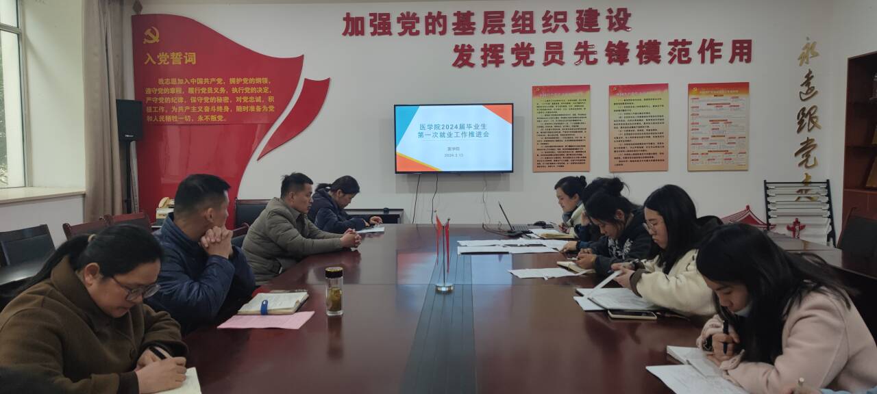 3月13日下午,医学院在党员活动室召开2024届毕业生第一次就业工作推进会,医学院党总支副书记(主持工作)邹华兵、副书记梁春艳及全体2024届毕业班辅导员参加会议。