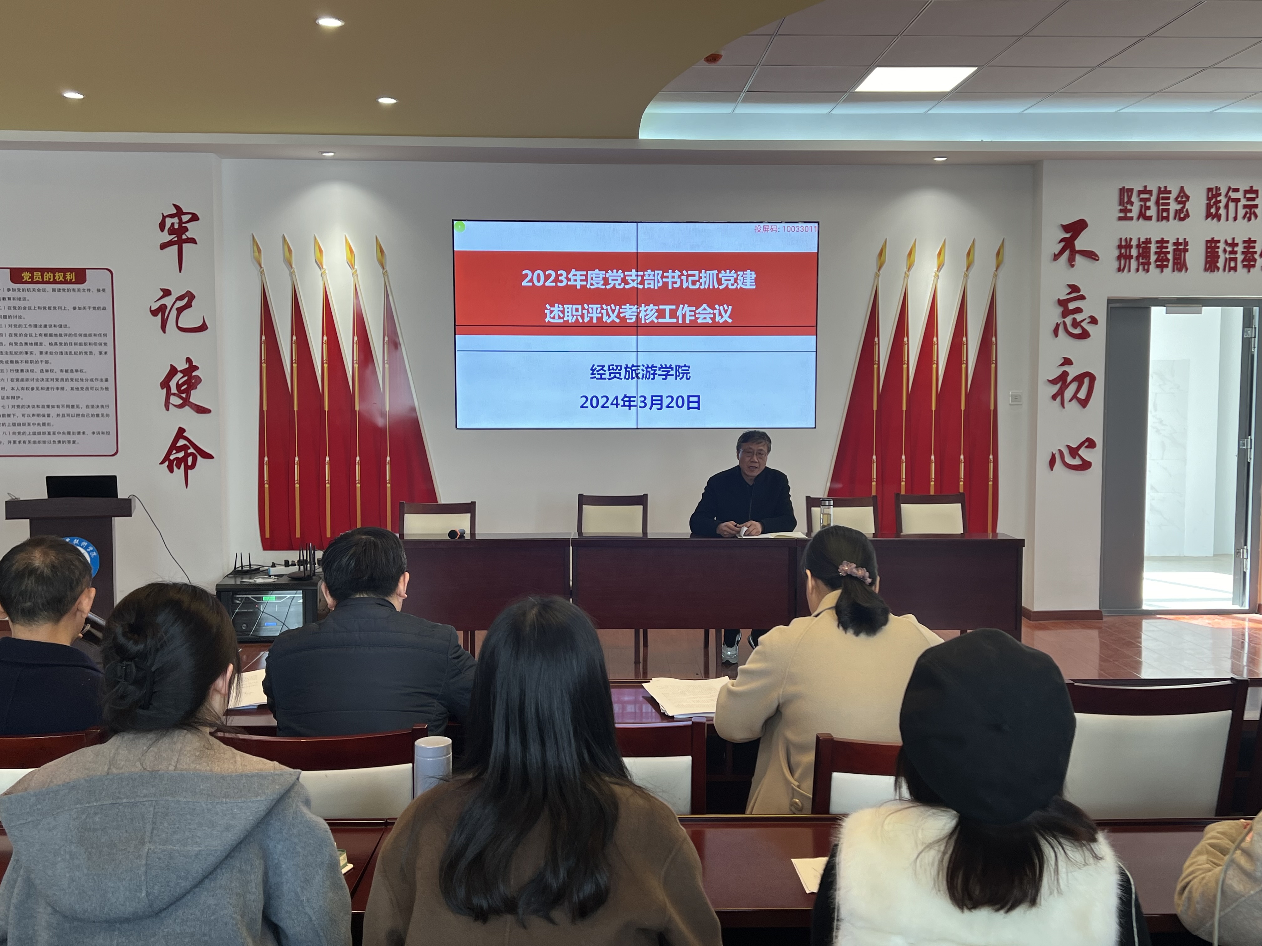为深入学习贯彻习近平新时代中国特色社会主义思想和党的二十大精神,推进全面从严治党向纵深发展,夯实党建工作基础,落实管党治党责任,以高质量党建引领学院高质量发展,3月20日下午,经贸旅游学院党总支组织召开所辖党支部书记抓党建工作述职评议会,学院党政领导、各部门负责人、各党支部书记、党员同志、民主党派代表和群众代表参加会议,会议由该院党总支书记梅亚松同志主持。