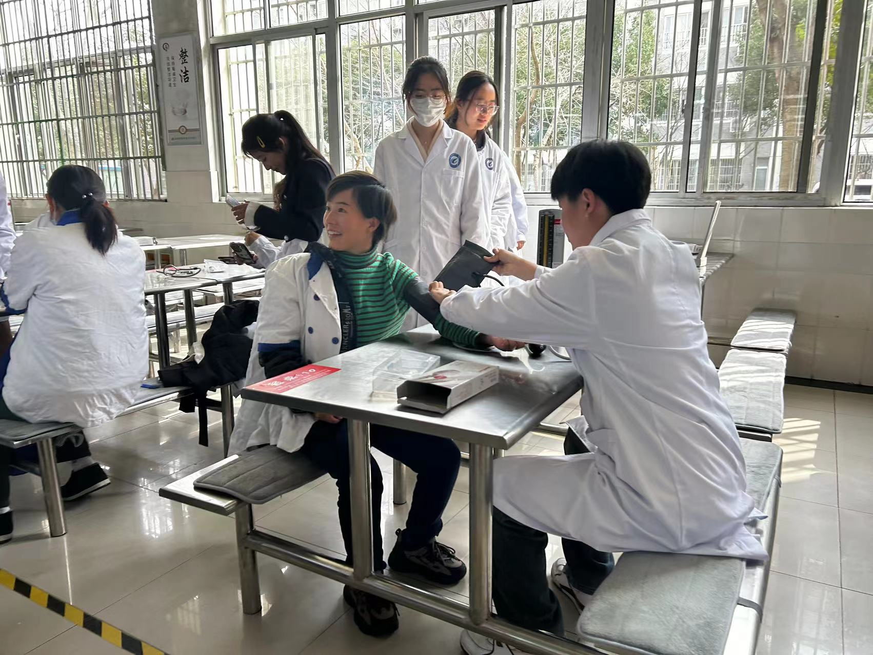 学而社康复之家在鼓山校区二食堂开展“学雷锋精神,行医者仁心”主题志愿服务活动。课余时间,同学们携带血压计等医疗物品,娴熟地为食堂工作人员和其他闻讯赶来的老师、后勤工作人员测量血压,介绍高血压病的基本常识,普及健康知识。叔叔阿姨们纷纷表示,感谢同学们的付出,能够有机会了解自己的血压状况并掌握一定的健康常识。