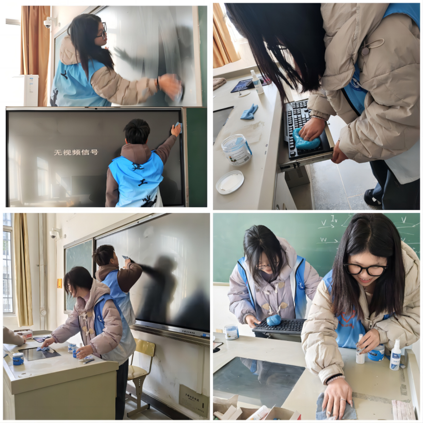 “青年志愿行 教室焕新颜”志愿服务活动。为了确保开学第一天教学活动的有序进行,让师生有个洁净、愉悦的教学环境,3月3日,在新学期开始的前一天,“建小志”们细心的带来专用清洁工具,分工明确、相互配合,对教学C楼所有代管教室的电脑屏幕和键盘进行了全方位的清扫,不留尘埃,开启明亮新学期。