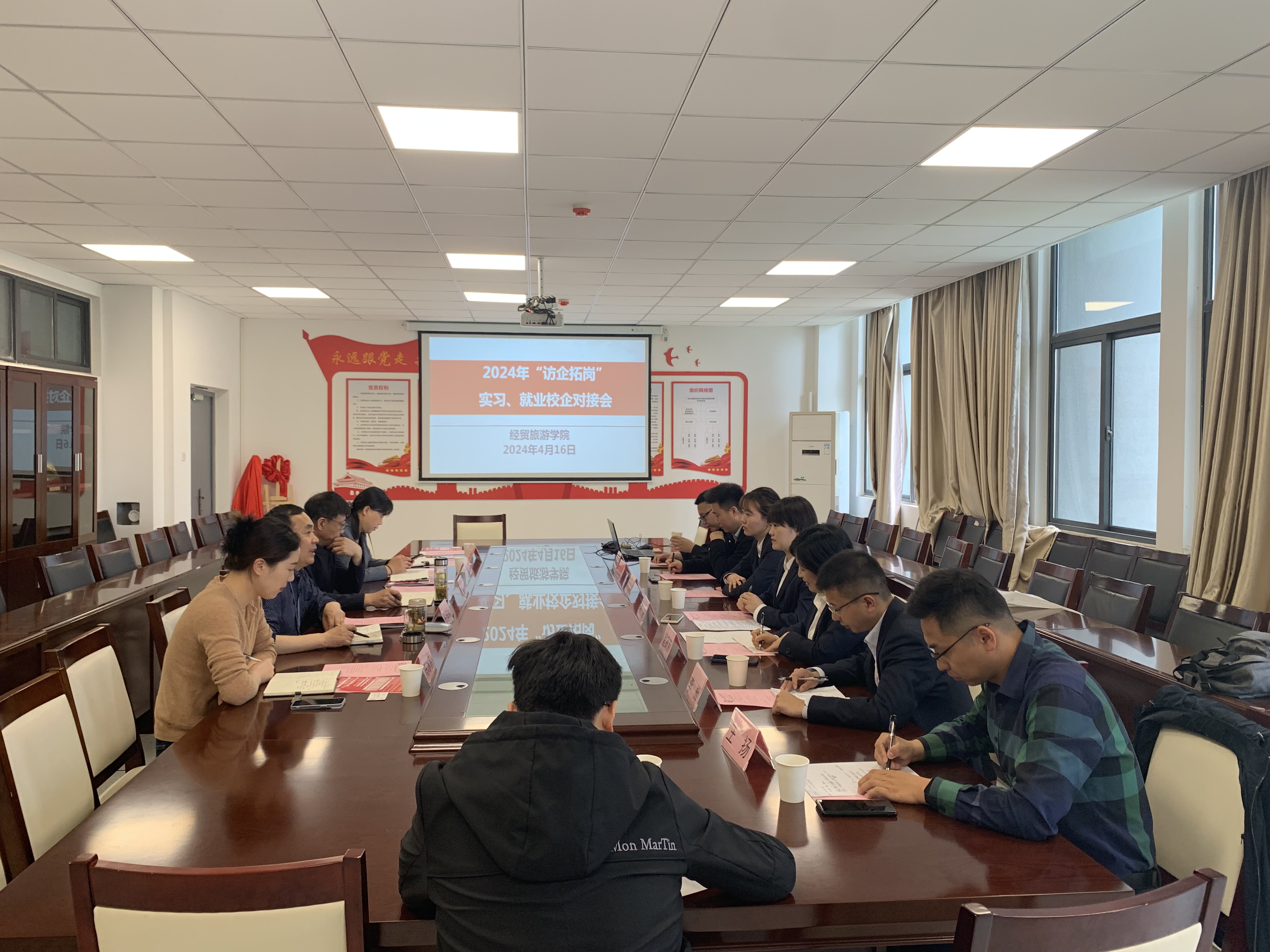 为深入贯彻《关于开展全国高校书记校长访企拓岗促就业专项行动的通知》要求,提升学生就业质量,4月16日上午,安徽满辰科技集团股份有限公司、安徽辰元物业管理有限公司、安徽邻几便利店有限公司、安徽阳光信通电子科技有限公司四家单位到访经贸旅游学院进行就业洽谈,学院党总支书记梅亚松、院长赵红、副院长陈继林,以及负责学院实习就业的相关老师参加本次会议,会议由陈继林主持。