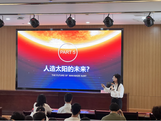 张素贞博士分别从什么是人造太阳?人造太阳有什么用?为什么人造太阳?人造太阳怎么造和人造太阳的未来等五个方面,向同学们简单扼要地介绍了中国科学家在人造太阳研究领域的前沿动态、核聚变领域研究的成果以及研究过程中的艰辛,将那些晦涩难懂的科学知识变得通俗易懂,让同学们仿佛置身于科学的殿堂之中,亲眼目睹了科学家们多年来在人造太阳研究领域的努力与成果。此外,她还分享了科学家们在探索未知领域时所面临的挑战和机遇,让大家深刻地认识到了科学探索的艰辛与乐趣。在演讲的最后,张博士鼓舞同学们要向着太阳,脚踏实地,勇敢地去探索科学真理,勇敢地去追逐梦想,为人类文明的进步贡献出自己的智慧和力量。