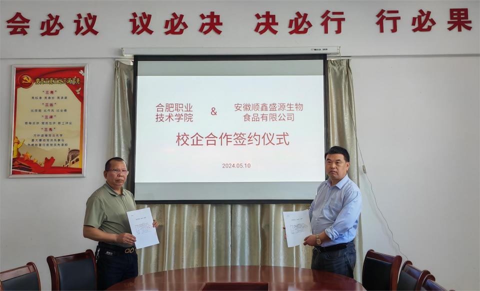 5月10日,生物工程学院院长刘修树、基础教研室沈慧及宋英明老师等一行赴滁州与安徽顺鑫盛源生物食品有限公司签订前期沟通的横向合作协议。此次合作项目聚焦于植物基粉酶解技术及工艺研究,旨在推动植物基粉原料处理工艺的优化升级,促进酶解质量安全指标的提升。