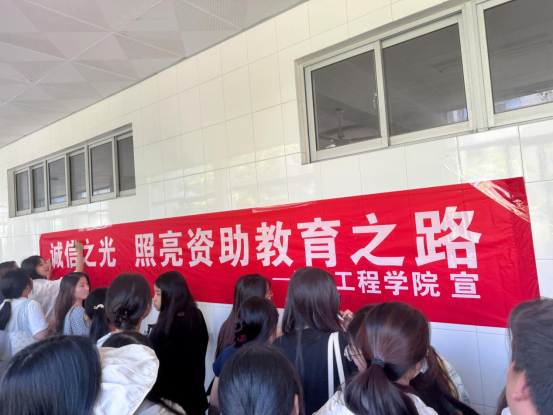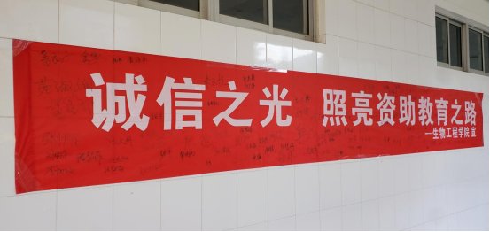 随后,该院还组织了诚信签名活动。一幅印有“诚信之光,照亮资助教育之路”的横幅在教学楼B楼二层教室的墙壁上静静悬挂。同学们在横幅上留下了自己的签名。每一个签名都代表着一份对诚信的承诺,一份对责任的担当。