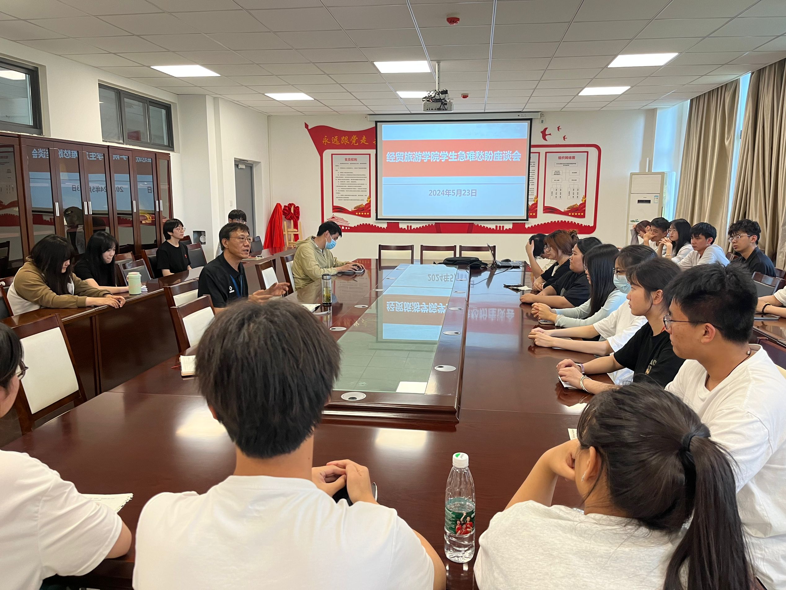 为进一步倾听学生心声,解决学生实际问题,不断提升教育管理服务水平,推进学生工作落细落实,经贸旅游学院于5月23日下午召开解决学生“急难愁盼”问题座谈会。本次座谈会由该院团总支董如恺老师主持,学院党总支书记梅亚松、党总支副书记刘圣春、学管办全体教师以及在校班级学生代表参加。