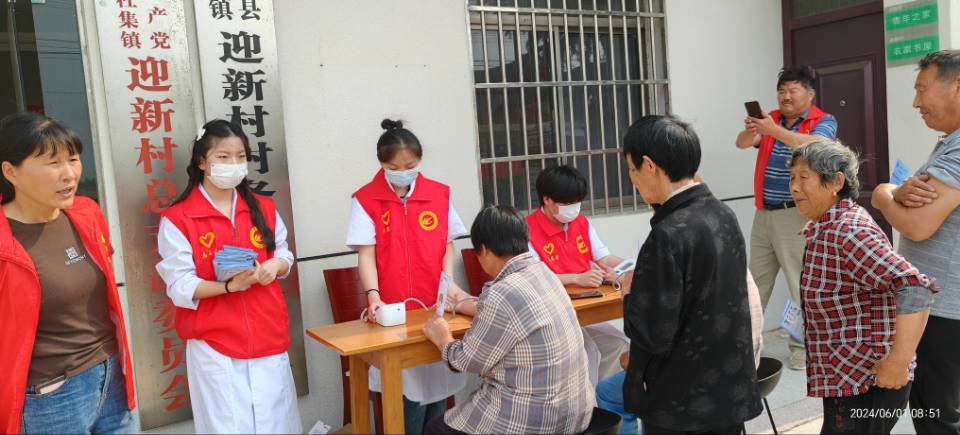 送温暖。医学院志愿者在梁春艳的带领下为迎新村老年人开展了健康大问诊。在村委会活动广场,学生志愿者们耐心地与每一位前来问诊的老人进行交流,逐一为老人测量血压、血糖。对于每一位来问诊的老人,志愿者们仔细询问其身体状况,用通俗易懂的语言给予耐心细致的解答,倡导健康的生活方式。提醒老年人要定期检查身体,如有高血压等健康问题需遵医嘱进行服药,叮嘱村民合理饮食、均衡营养,养成良好的生活习惯,保持愉悦心情,并进行适度锻炼。健康义诊活动得到了老人们的肯定,希望今后能经常性开展。