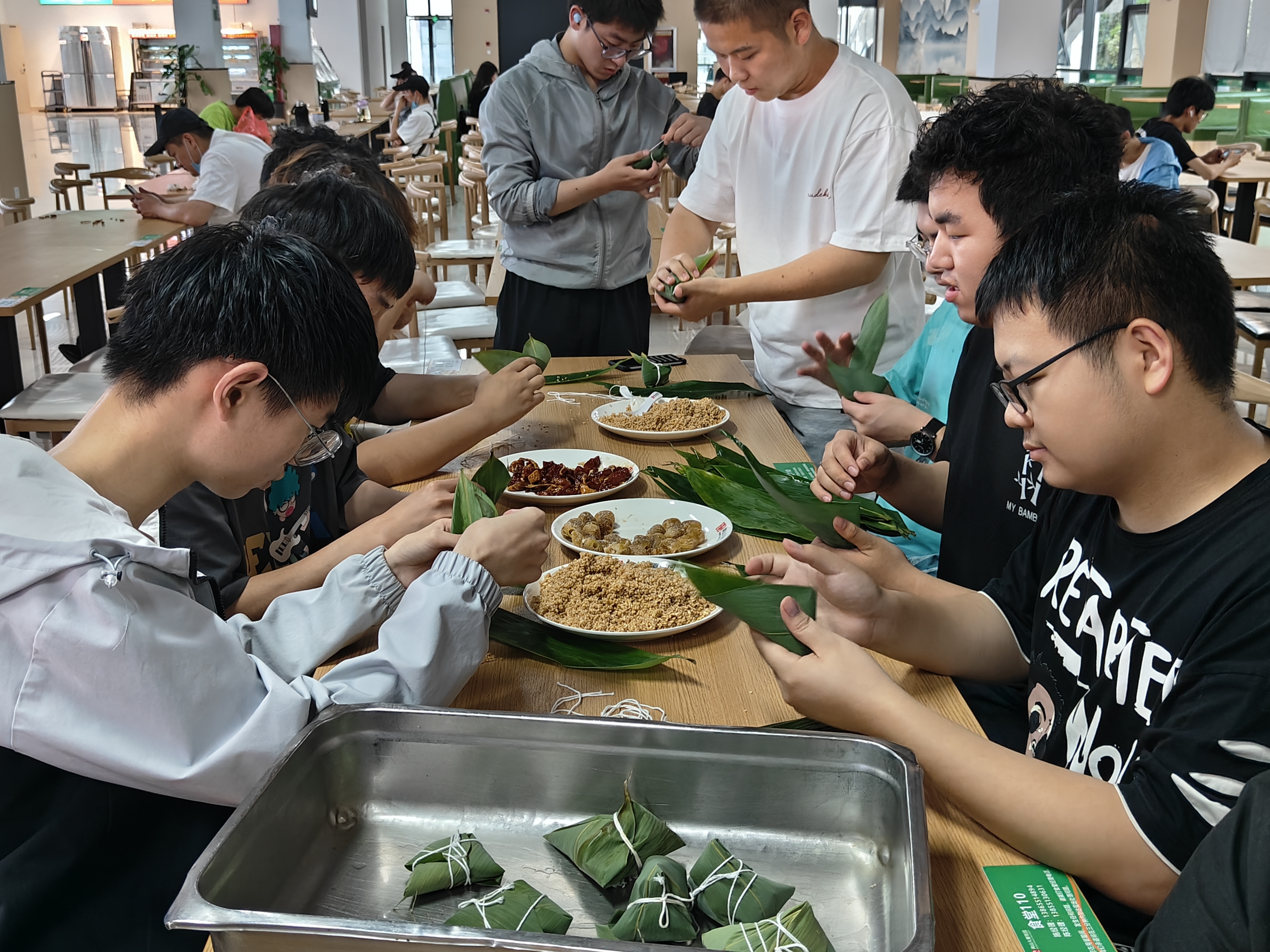 活动现场,很多同学们初次尝试包粽子,手法生疏,包的粽子形状各异。在食堂阿姨的热心指导下,同学们认真上手实践,逐渐掌握了包粽子的窍门。折紧粽叶、压实糯米、绑牢绳子,就是这一折一弯一包的动作,在每个人的手里展现出来不同形态的粽子,有三角形的,四边形的,多边形的,以及圆乎乎的没有棱角的,同学们愉快地分享着自己家乡端午节的习俗,在包粽子的过程中感受到了端午节蕴含的悠久文化历史与传统。