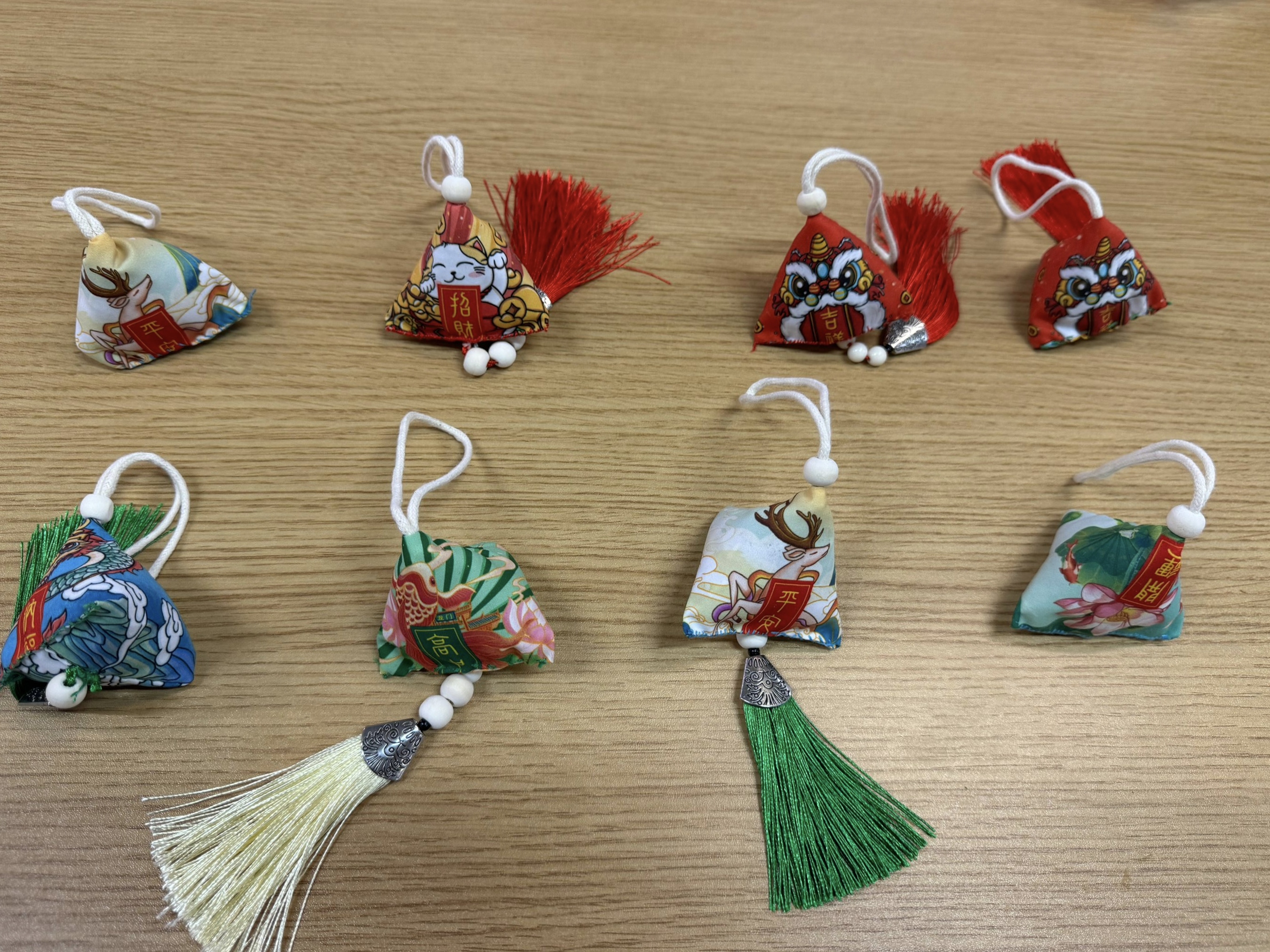 在制作香囊的环节中,志愿者首先讲解了端午节佩戴香囊的习俗,并耐心地教同学们如何制作艾草香囊。香囊,作为端午节的传统配饰,不仅具有独特的装饰性,更蕴含着驱邪避瘟、祈福纳祥的美好寓意。每个香囊的样式不同,寓意也不同,同学们精心挑选心仪的布料,仿佛也将自己的祝福与愿望一同缝进了这小小的香囊之中,每一针每一线都凝聚着心意和期盼。