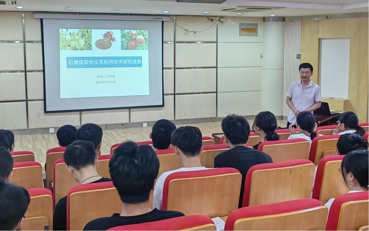 6月12日下午,生物工程学院在鼓山校区图书馆第二学术报告厅成功举办了以“石榴提取物及其制剂技术的研究进展”为主题的学术讲座。此次讲座由药学教研室主任、副教授范高福主讲,药学教研室专业教师、23级制药工程(专升本)专业、药学类专业学生代表参与。