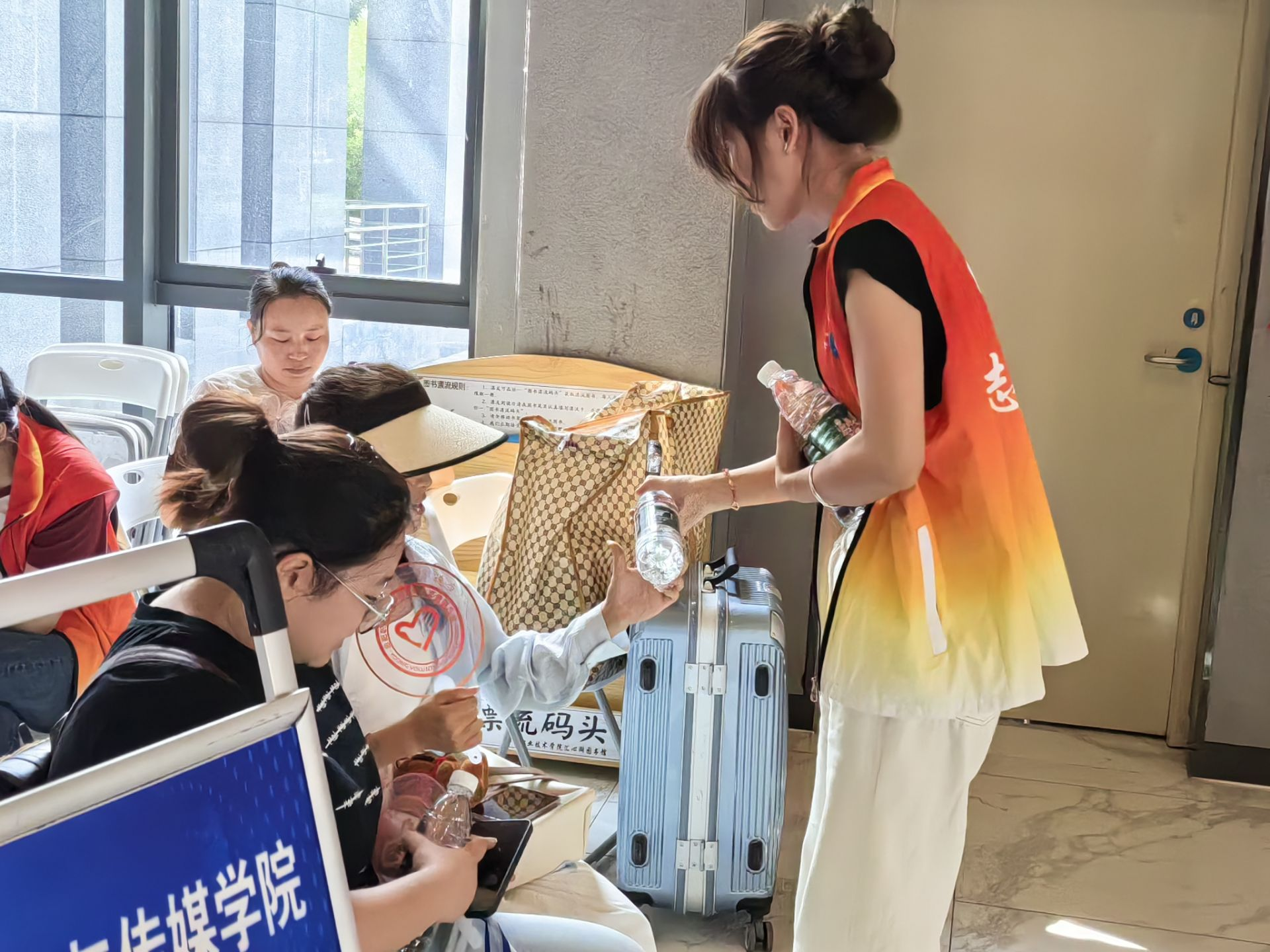 迎新志愿者,挥洒汗水送“爱心”。在开学准备工作中,学院十分重视迎新志愿者的选拔与培训。在培训中,特别强调迎新志愿者要担任好“迎宾员”“服务员”“公关员”“形象大使”四种角色。迎新当天,志愿者们用他们的行动践行了这些角色担当。上午七点十分准时志愿者们在大学生事务中心集合,摆放座椅,布置迎新点。新生进校,志愿者们做好报到引导、行李搬运、疑问解答等服务,炎热的天气阻挡不了志愿者们的脚步,学兄学姐们挥汗如雨的“热心”送出的也是学院对新同学满满的“爱心”。