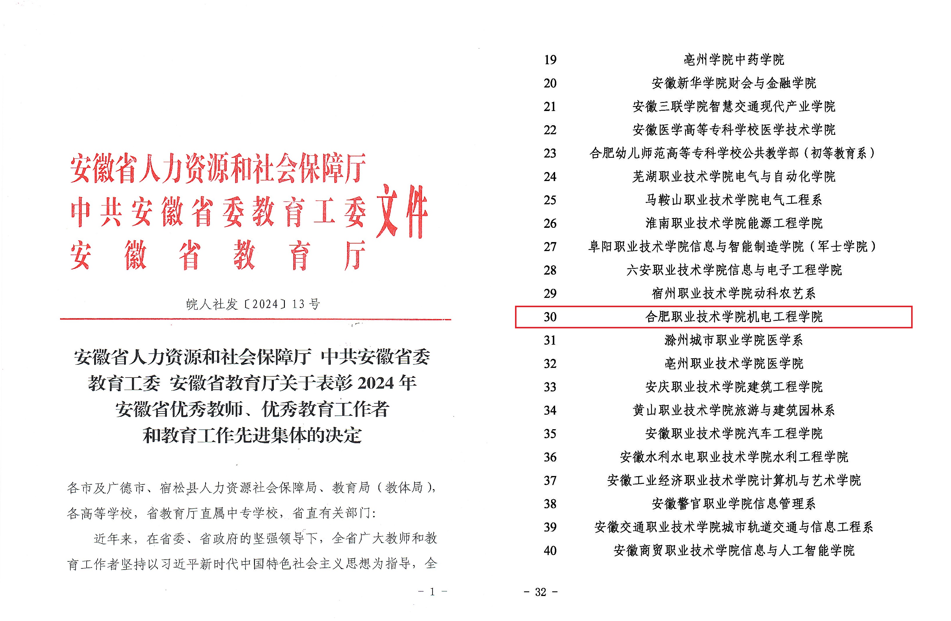 近日,安徽省人力资源和社会保障厅、中共安徽省委教育工委、安徽省教育厅发布了《关于表彰2024年安徽省优秀教师、优秀教育工作者和教育工作先进集体的决定》。机电工程学院凭借其在教育教学、产教融合及人才培养等多个领域取得的成就,荣获了2024年“安徽省教育工作先进集体”荣誉称号。