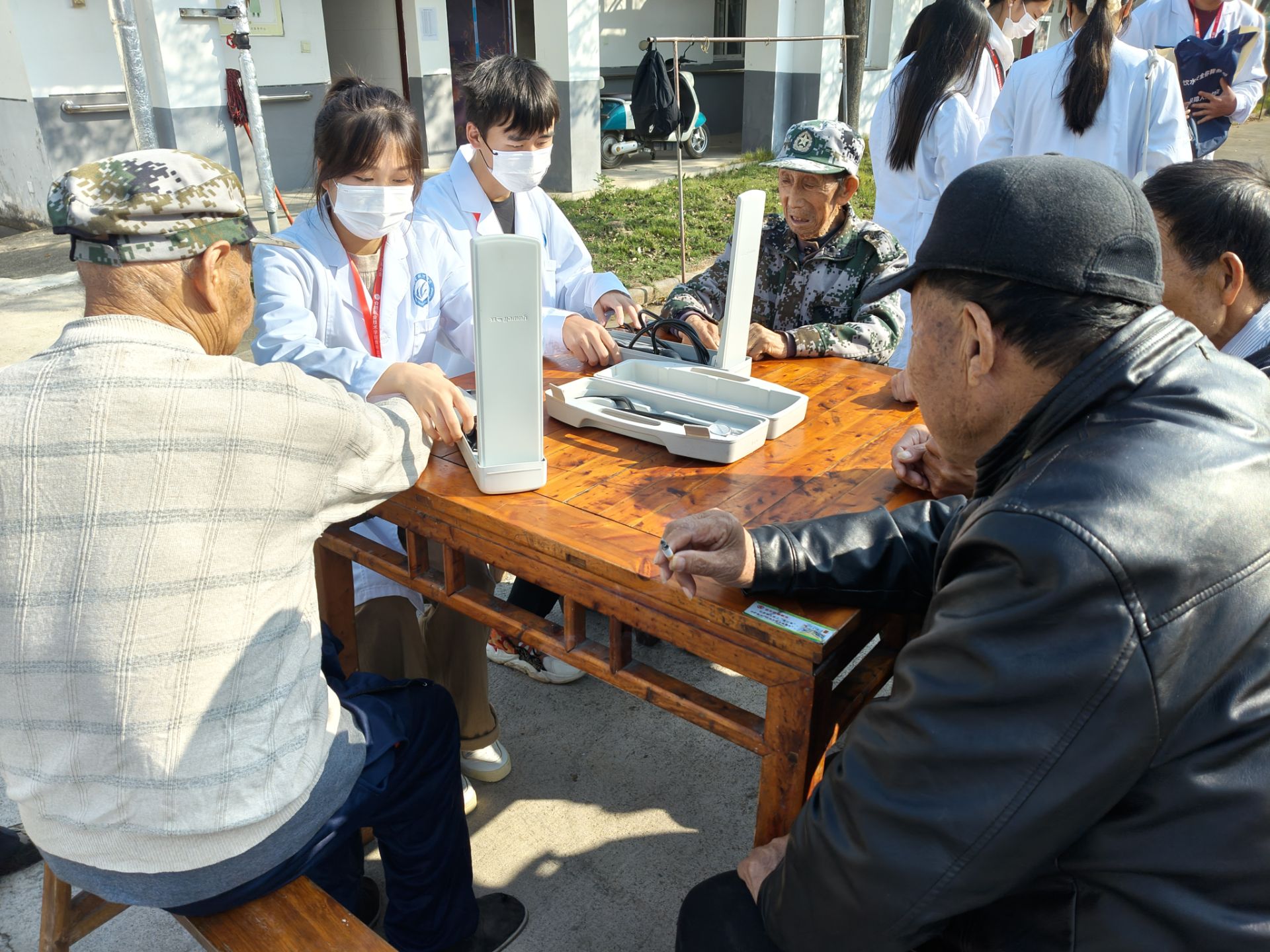 活动当天,志愿者们早早地来到养老院,他们统一着装,分工明确,迅速投入到紧张而有序的工作中。汽车工程学院分会的志愿者们秉持着“宁可多跑一趟,不漏一位老人”的原则,逐楼逐屋地通知并协助老人们前往检查区域,确保每位老人都能享受到健康检查服务。医学院分会的志愿者们则发挥自己的专业优势,为老人们测量血糖和血压,耐心询问他们的身体状况,并记录形成健康档案。志愿者用亲切的话语与老人交谈,详细了解他们的生活情况,志愿者的真情问候,让老人们内心顿感温暖,脸上更是洋溢着开心的笑容。