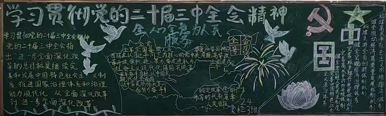 为深入学习宣传贯彻党的二十届三中全会精神,充分发挥好“黑板报”传统宣传阵地作用,引导广大青年学生深刻领会本次全会精神实质和丰富内涵,积蓄新征程的奋进力量,生物工程学院于11月底组织24级班级开展“学习党的二十届三中全会精神,勇担时代使命”主题黑板报活动。