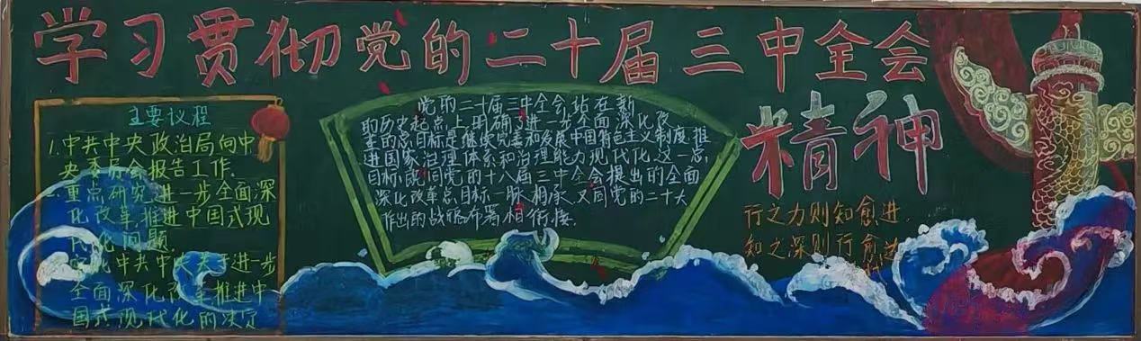 奋斗正当时,青春献给党。本次活动以黑板报展示的形式描绘所思所感所愿,学习宣传党的二十届三中全会精神。同学们用一幅幅色彩鲜艳、字迹端正、切合主题的黑板报来表达对党和国家的热爱,展现了当代青年大学生昂扬向上的精神风貌。
