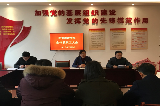 春风和煦,春意盎然。2017至2018学年度第二学期如期而至。为了更好地谋划新学期各项工作,全面提升工作质量,2018年3月7日下午,经贸旅游学院全体教职工大会顺利召开。大家齐聚一堂,共商发展。