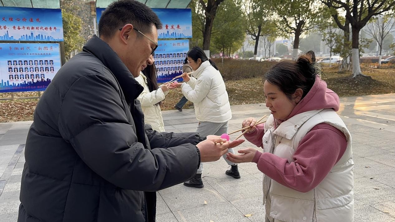 齐心协力比赛更是趣味十足。前面的队员抱住后面队员的腿,喊着口号齐心协力地向前行进。各小组你追我赶,竞争激烈。乒乓球接力则既考验奔跑速度,也考验手部的稳定度。大家小心翼翼的用筷子夹起乒乓球快速传递给下一棒队员,稍有不慎,乒乓球落地就得重来,现场气氛又紧张又热烈。套圈游戏现场,更是火爆异常,大家瞄准奖品,大展身手,满载而归。