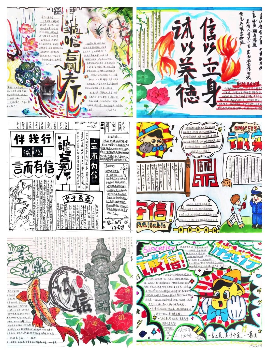 活动一经启动,便得到了同学们的积极响应和热情参与,共计征集作品42件。同学们根据自己对“诚信”的体会和感悟,展开丰富的想象和创作。他们通过精美的图画、工整的字迹和深刻的寄语,表达了自己对诚信的认知和承诺。手抄报的内容涵盖了诚信的意义、诚信考试、资助诚信等多个方面,通过一幅幅图文并茂、主题鲜明的手抄报作品,将诚信的美德植根于心间。