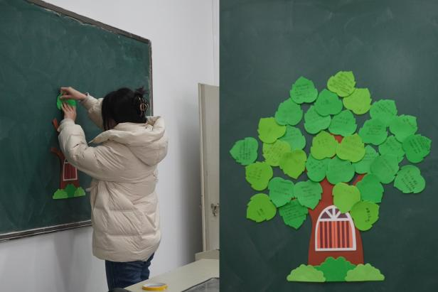 在“春天的愿望树”环节,每位同学在“树叶”上写下自己的心愿,并将其贴在一棵大树的“枝干”上。随着一片片“树叶”的增添,原本光秃秃的树枝逐渐变得枝繁叶茂,象征希望与梦想的“愿望树”在大家的共同努力下焕发出勃勃生机。接着,在心理老师的引导下,同学们进行了八分钟的冥想体验。伴随着轻柔的音乐,大家闭上眼睛,放松身心,感受内心的平静与安宁。