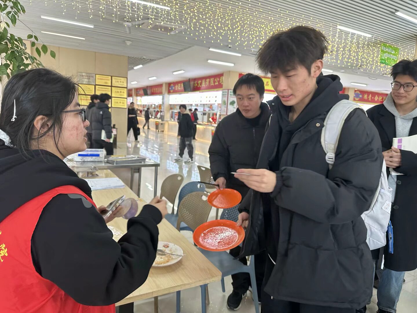 中午11时,活动正式拉开帷幕。志愿者们分为“文明督导组”与“趣味互动组”两个团队。督导组同学佩戴志愿服务袖标,驻守食堂餐盘回收处,细致观察同学们的剩饭情况。对“光盘达标”者,志愿者会赠送一枚印有“光盘之星”的定制便利贴,并引导其前往大学生活动中心旁的互动区。另一边,互动组志愿者早已布置好“光盘标语墙”和套圈游戏区,同学们在便利贴写“支持光盘行动”等宣传语后,即可领取三个套圈参与游戏。