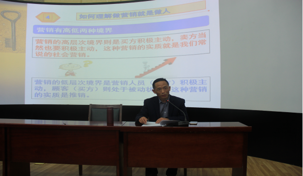 刘圣春教授的报告内容丰富,图文并茂,从“营销就在我们身边”“为什么说做营销就是做人”“如何理解做营销就是做人”“如何实现做营销就是做人”等四个方面进行了深入浅出的讲解。