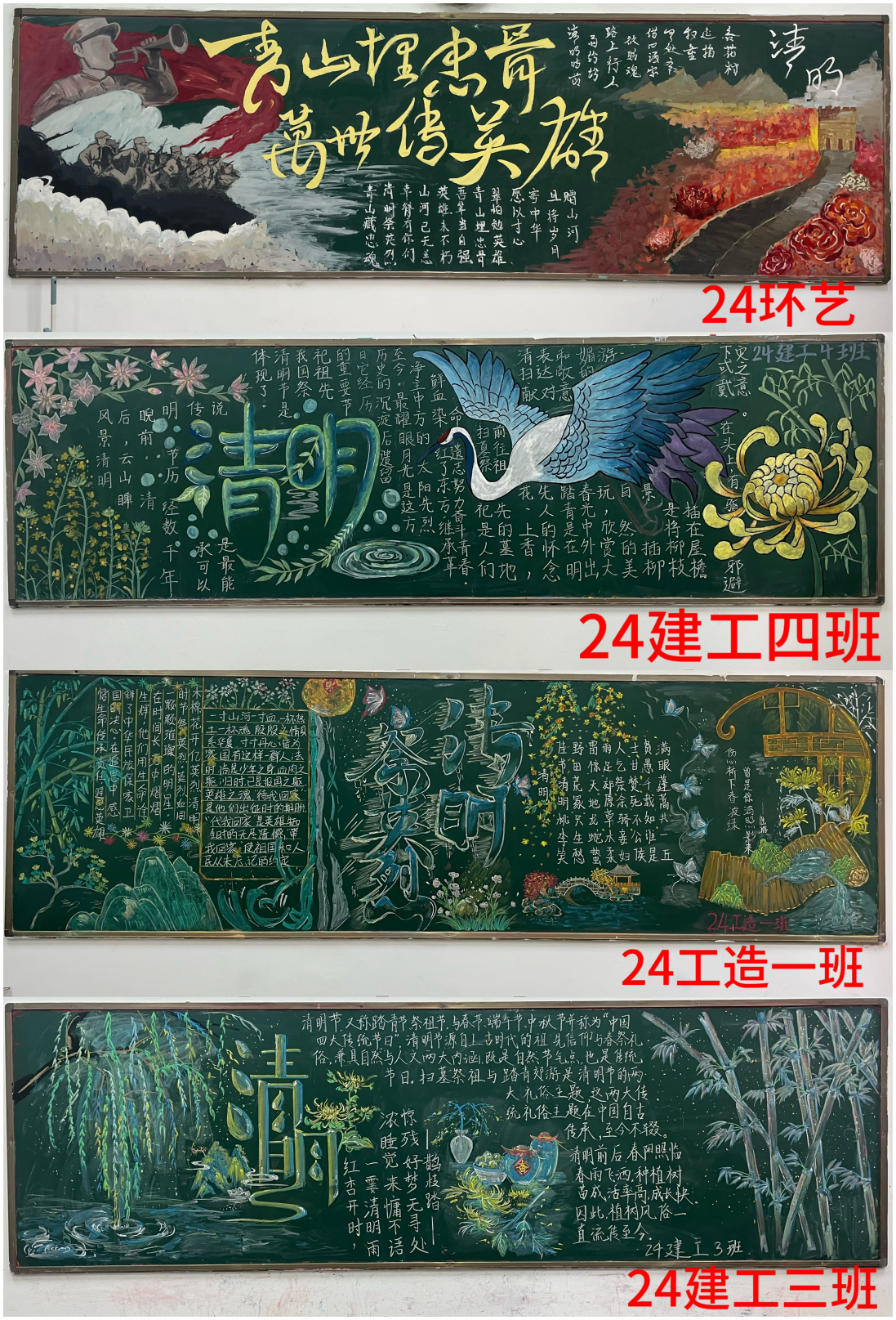 各班级的黑板报各具特色,有的以庄严肃穆的烈士陵园为背景,搭配简洁有力的文字,表达对英烈的深切哀悼;有的通过绘制革命先烈的英勇事迹画面,如长征、抗日战争等场景,生动展现了英烈们为国家独立和民族解放抛头颅、洒热血的壮丽篇章。经过评选,24环艺班等九个班级分别获得一、二、三等奖。