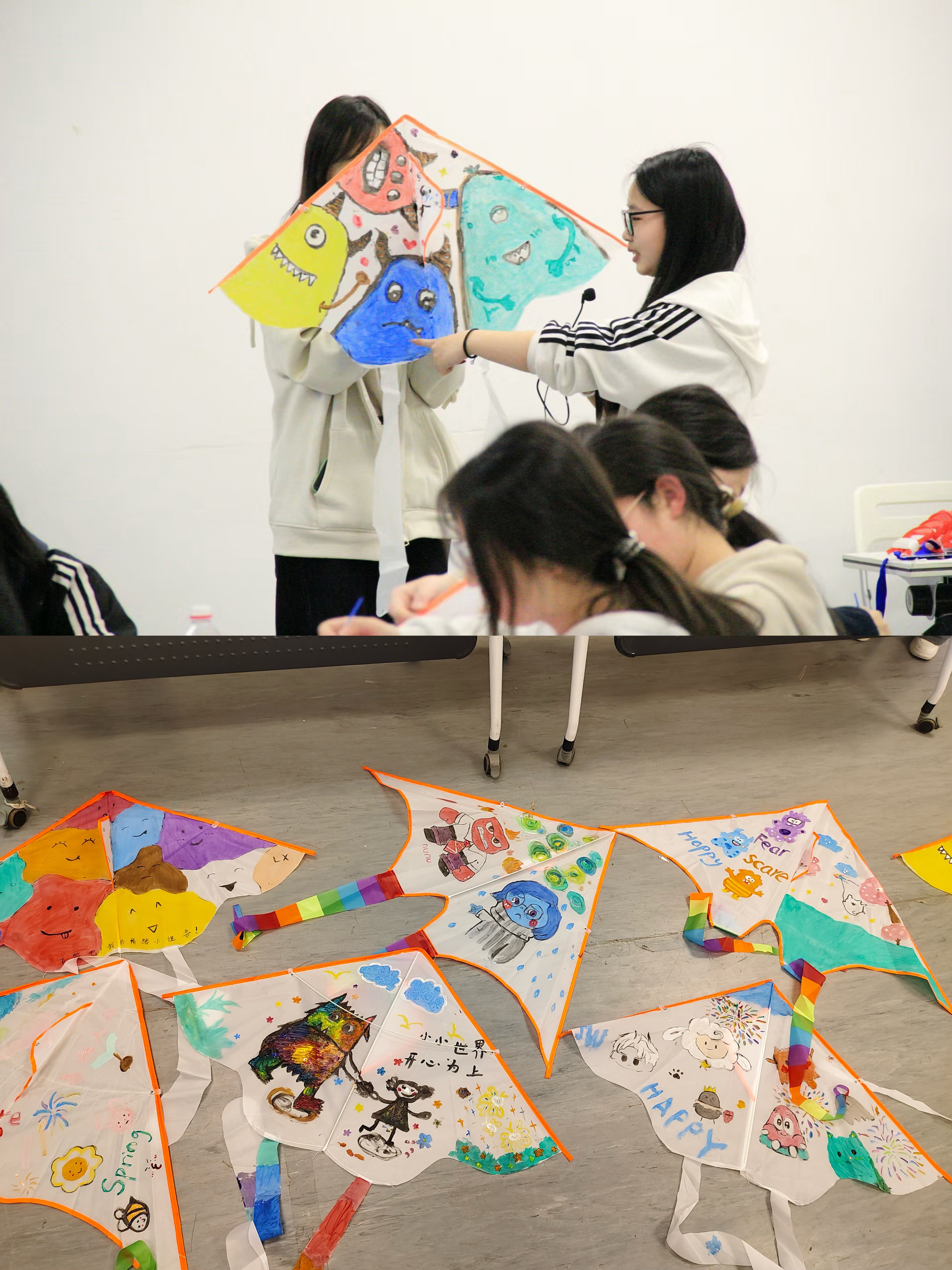 创意DIY:绘制专属“情绪小怪兽”。在绘本的启发下,同学们领取空白风筝和彩绘材料,开始创作属于自己的“情绪小怪兽”。有人用明快的黄色勾勒出快乐的笑脸,有人用深蓝色描绘忧郁的云朵,还有人将多种色彩交织,展现情绪的复杂变化。活动现场欢声笑语,大家尽情发挥想象力,让心中的情绪跃然纸上。
