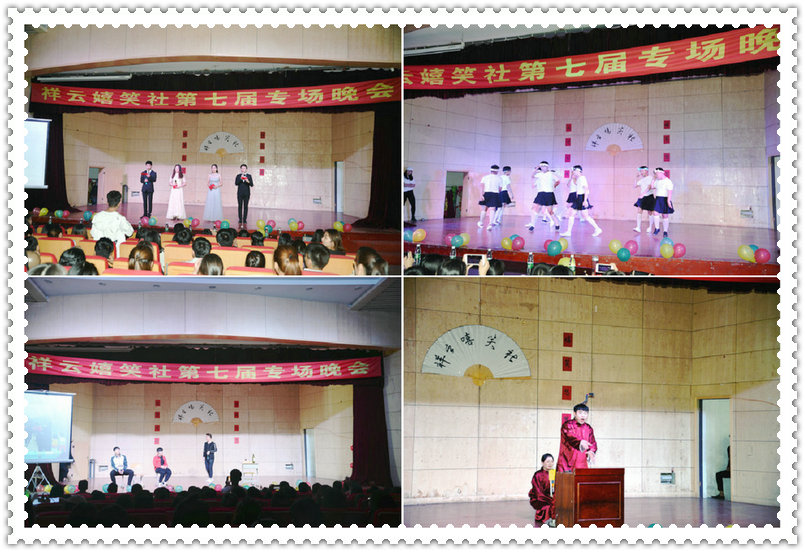 祥云嬉笑社是经贸旅游学院成立较早、活动规范、特色鲜明的学生社团。本次晚会节目种类多样、内容丰富多彩,相声、小品、话剧等精彩纷呈;同学们以其青春的气息、新颖的题材、夸张的表演,溶亲情、友情、师生情于一体,一次次地将晚会的气氛推向高潮。晚会中场的互动环节,更是将台上与台下连成一体。整场晚会气氛热烈,充分展示了祥云嬉笑社的特色——说学逗唱,嬉笑怒骂,皆成文章。