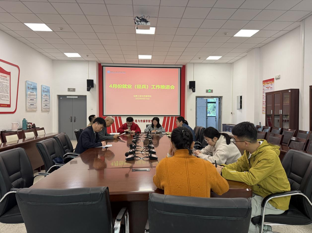 为进一步抢抓机遇,压实责任,破解当前工作中的难点堵点问题,推动就业工作冲刺攻坚,4月15日,信息工程与传媒学院在一楼会议室召开2025届毕业生就业(征兵)工作推进会。该院党总支副书记(主持工作)尹仕果、党总支副书记江寅昌及全体毕业班班主任参加此次会议。会议由江寅昌主持。