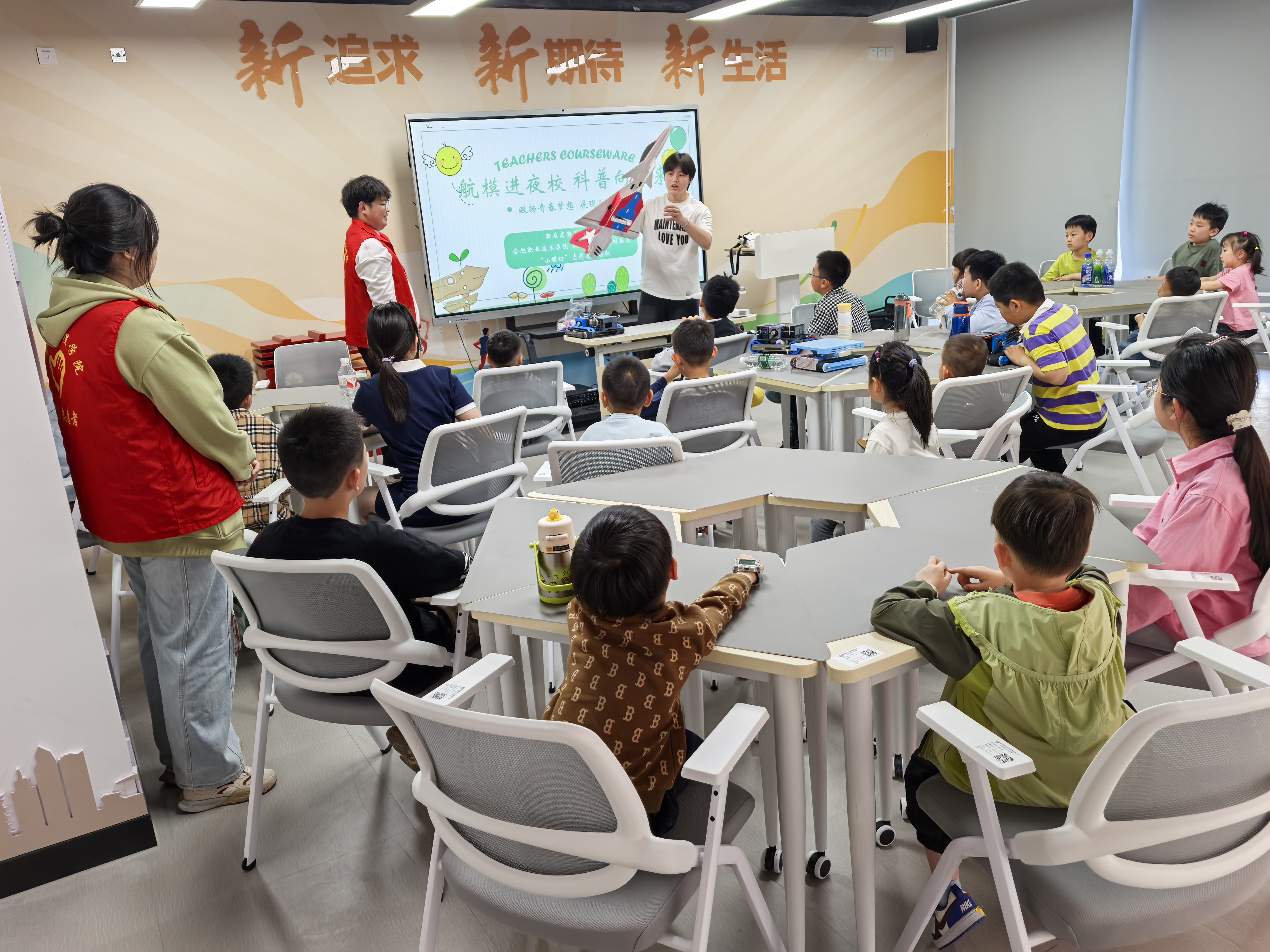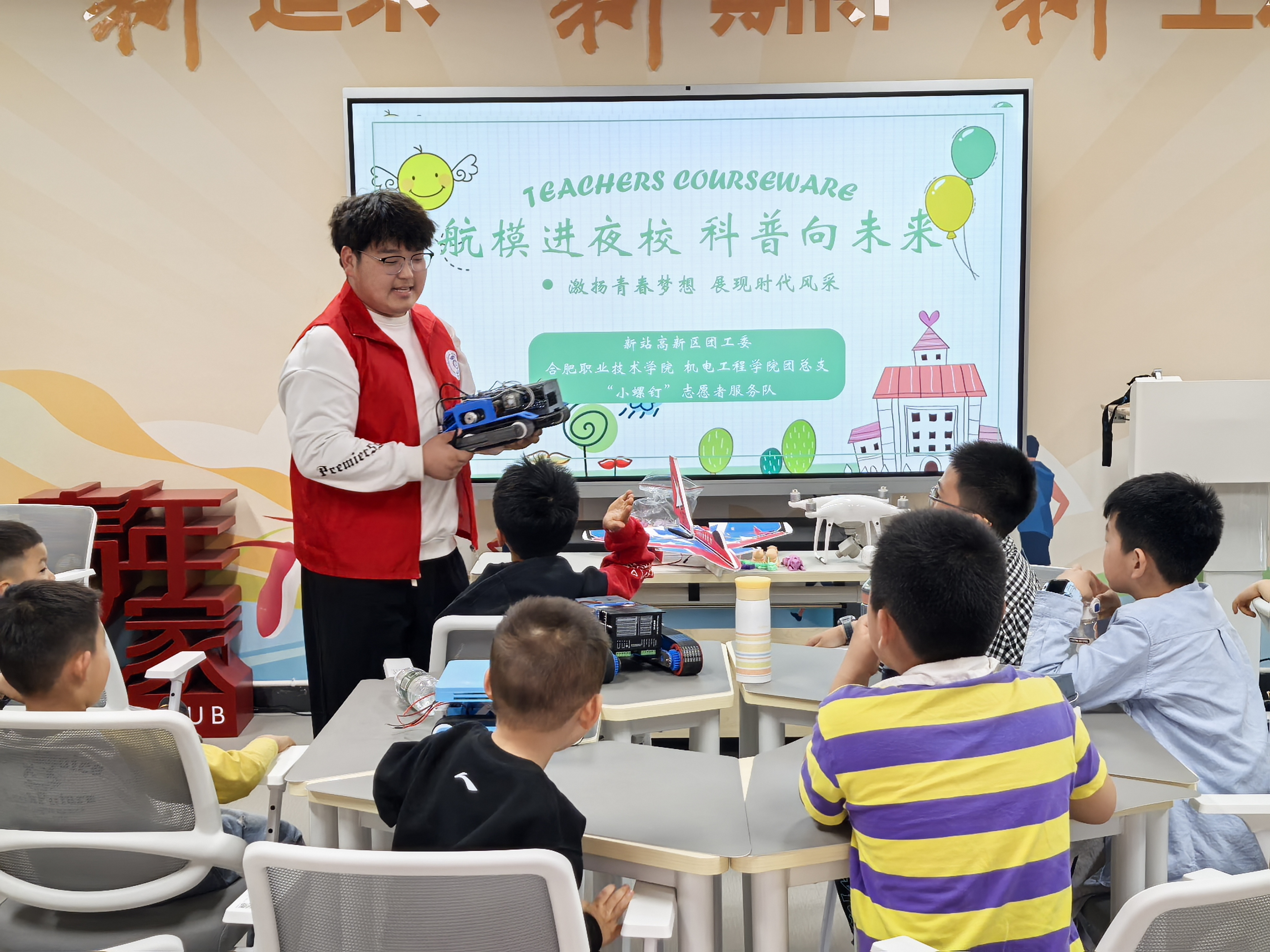 航模腾空传科技,科普互动育童心。为切实提高社区青少年儿童的思想政治素质和科学文化素质,增强在校大学生动手实践与团队协作能力,激发创新思维与探索精神。4月26日下午,机电工程学院“小螺钉”志愿服务队12名志愿者走进合肥新站高新区工人文化宫,为社区孩子们带来了一场别开生面的科普教育志愿服务活动。